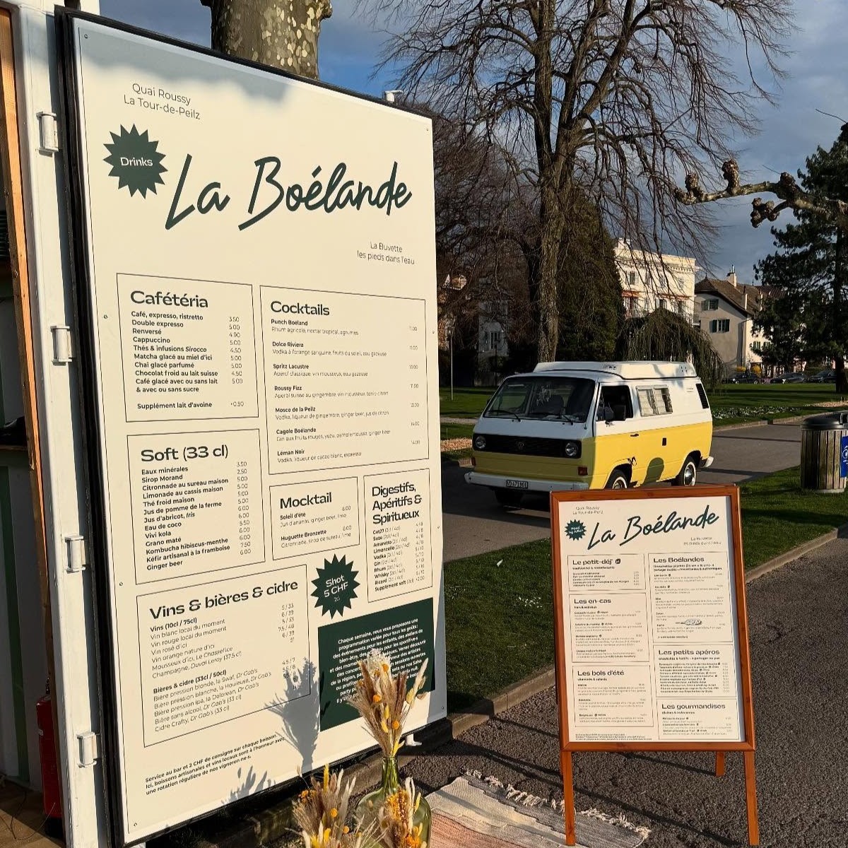 La Boélande, située sur les quais du Roussy à La Tour-de-Peilz, vous accueille de début avril à fin octobre 2026. Située face au lac, les pieds dans l’eau, elle vous propose une cuisine du soleil, fraîche et de saison, accompagnée de cocktails de qualité, dans une ambiance conviviale et estivale.